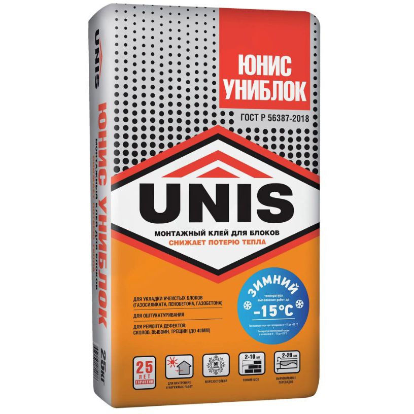 Кладочно-монтажный клей Юнис (Unis) Униблок зимний - это идеальное решение для профессиональных мастеров и домашних умельцев, которые стремятся к качественным и долговечным результатам в строительстве. Этот клей специально разработан для работы в холодное время года, что делает его незаменимым помощником при проведении кладочных работ в зимний период.